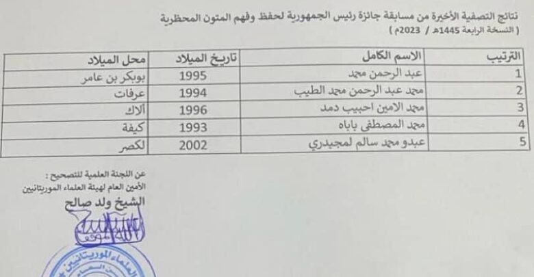 ووفق النتائج المعلنة من طرف اللجنة العلمية للتصحيح، برئاسة الأمين العام لهيئة العلماء الموريتانيين الشيخ ولد صالح، فقط جاء ترتيب الخمسة الأوائل كما يلي:
