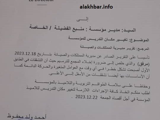 وجهت وزارة التهذيب الوطني وإصلاح النظام التعليمي إنذارا إلى مدرسة “منبع الفضيلة” الخاصة في مقاطعة تفرغ زينة بولاية نواكشوط الغربية، وأمرتها باتخاذ الإجراءات اللازمة لتغيير مكان تدريس تلاميذها قبل الجمعة القادم.