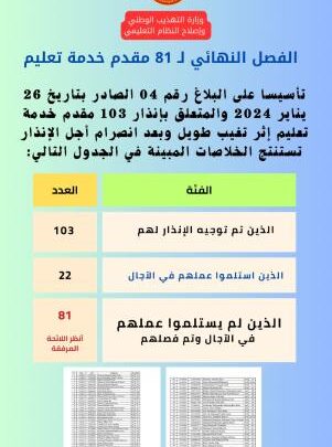 أعلنت وازرة التهذيب فصل 81 من مقدمي خدمات التعليم. وجاء القرار بعد إنذار المعنيين، ومنحهم المدة المحددة للالتحاق بأماكن عملهم. اللائحة :