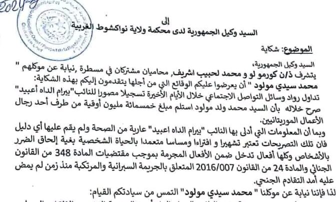 تداولت عدة منصات على الوسائط وثيقة حررت من طرف محاميين تبين رفع محمد ولد مولود دعوى قضائية ضد النائب برامه الداه اعبيد بتهمة التشهير و الافتراء