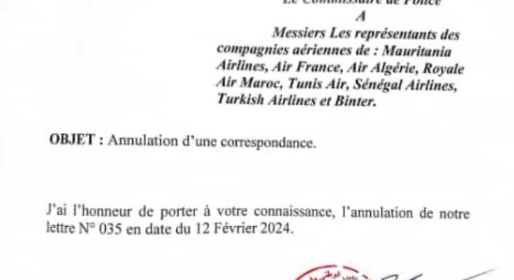 وقع مفتش الشرطة تارو حماده مذكرة موجهة إلى ممثلي شركات الطيران العاملة في موريتانيا، ألغى بموجبها المذكرة الصادرة عن المفوض السابق لمفوضية الشرطة في المطار أحمد ولد ماموني، والتي أدت لإقالته من منصبه.