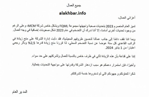 وقالت الشركة في رسالة وجهتها إلى العمال إن الزيادة جاءت انطلاقا من وقوف الشركة إلى جانب عمالها لتحسين ظروفهم المعيشية، مذكرة بأن هذه الزيادة تأتي في ظرف خاص بالنسبة للعمال وللشركة.