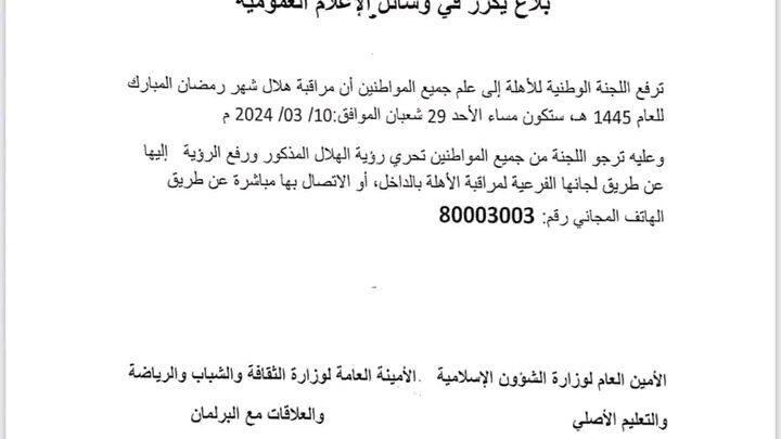 دعت اللجنة الوطنية لمراقبة الأهلة جميع المواطنين إلى تحري رؤية هلال شهر رمضان المبارك مساء الأحد 29 شعبان الموافق 10 مارس 2024