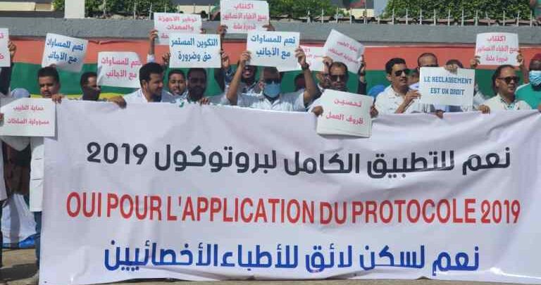 نظمت نقابة الأطباء الأخصائيين في موريتانيا، اليوم الجمعة، وقفات احتجاجية أمام كل من المستشفى الوطنى بنواكشوط والمستشفيات الجهوية لروصو وألاگ وكيفه، تزامنا مع توقف عن العمل لمدة ساعتين، احتجاجا على ما أسموه “المماطلة وسياسة النعامة التى تنتهجها الوزارة تجاه الوضعية الصعبة والظروف السيئة التى يعيشها الطبيب الأخصائي الموريتاني”.