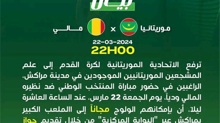 قالت اتحادية كرة القدم الموريتانية في بيان تحصلت عليه تلماس ان المشجعين للمنتخب الوطني في مدينة مراكش المغربية يمكنهم الحضور لمباراته ضد المنتخب المالي بشكل مجاني و ذالك عن طريق البوابة الرسمية حاملين جوازات سفر او بطاقات تعريف وطنية اللقاء سيكون مساءالجمعة العاشرة ليلا