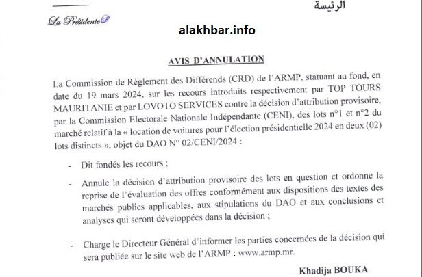 ألغت سلطة تنظيم الصفقات العمومية الصفقة التي منحتها اللجنة الوطنية المستقلة للانتخابات لوكالة “آفالاه رانت أكار” لتوفير 106 سيارات لمدة 120 يوما، وبمبلغ يتجاوز 227 مليون أوقية قديمة.