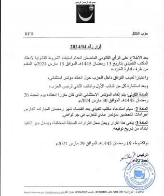 أعلن رئيس حزب تكتل القوى الديمقراطية، أحمد ولد داداه، إلغاء المؤتمر الاستثنائي للحزب و الذي كان مقررا، يوم غد الـ20 رمضان.