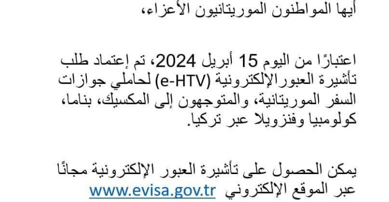 وقالت السفارة التركية في نواكشوط، إن تم اعتماد طلب تأشيرة العبور الإلكترونية لحاملي جوازات السفر الموريتانية، المتوجهين إلى المكسيك، بناما، كولومبيا وفنزويلا عبر تركيا، ابتداء من 15 ابريل الجاري.