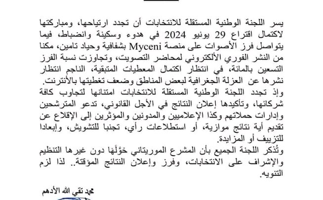 يسر اللجنة الوطنية المستقلة للانتخابات أن تجدد ارتياحها، ومباركتها لاكتمال اقتراع 29 يونيو 2024 في هدوء وسكينة وانضباط، فيما يتواصل فرز الأصوات على منصة Myceni بشفافية وحياد تامين، مكنا من النشر الفوري الألكتروني لمحاضر التصويت، وتجاوزت نسبة الفرز التسعين بالمائة، في انتظار اكتمال المعطيات المتبقية، الناجم انتظار نشرها عن العزلة الجغرافية لبعض المناطق وضعف تغطيتها بالأنترنت.