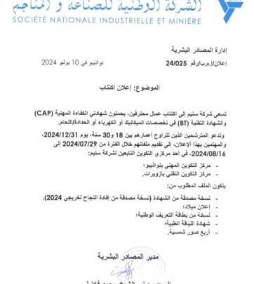 أعلنت الشركة الوطنية للصناعة و المناجم عن تنظيم مسابقة لاكتتاب عمال حرفيين يحملون شهادتي الكفاءة المهنية ( cap) أو الشهادة التقنية ( BT)