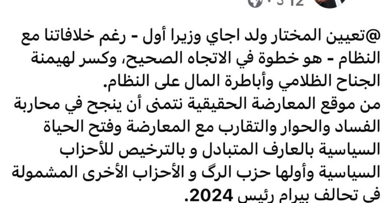 وأضاف الداه اعبيد في تدوينة عبر فيسبوك: “تعيين المختار ولد اجاي – رغم اختلافنا مع النظام – هو خطوة في الاتجاه الصحيح وكسر لهينمة الجناح الظلامي وأباطرة المال على النظام”.