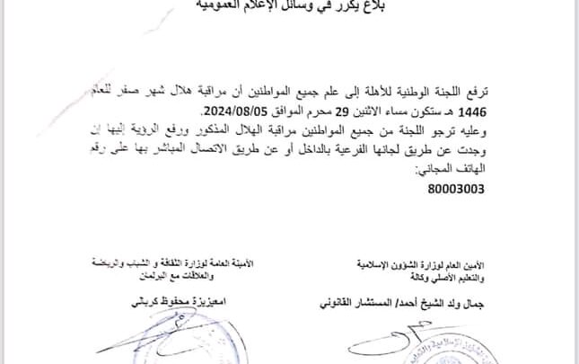 دعت اللجنة الوطنية للأهلة جميع المواطنين لمراقبة هلال شهر صفر للعام 1446 هجرية مساء غد الإثنين 29 محرم الموافق 5/8/2024