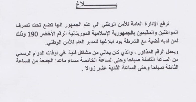 ترفع الإدارة العامة للأمن الوطني الي علم الجمهور انها تضع تحت تصرف المواطنين والمقيمين بالجمهورية الإسلامية الموريتانية الرقم الأخضر 190 وذلك لمن لديه قضية مع الشرطة يود ابلاغها للمدير العام للأمن الوطني.