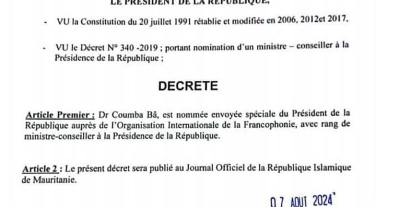 عين الرئيس محمد ولد الغزواني الوزيرة السابقة كمب با مبعوثة خاصة له لدى منظمة الفرانكفونية، وبرتبة وزير.