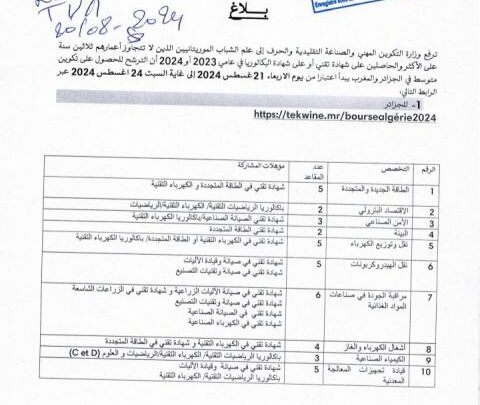 اعلنت وزارة التكوين المهمي و الصناع التقليدي و الحرف، عن تنظيم تكوين متوسط في المعاهد الجزائرية و المغربية، لصالح الشباب الموريتانيين الحاصلين على شهادة تقني او الباكولوريا 2023/2024..