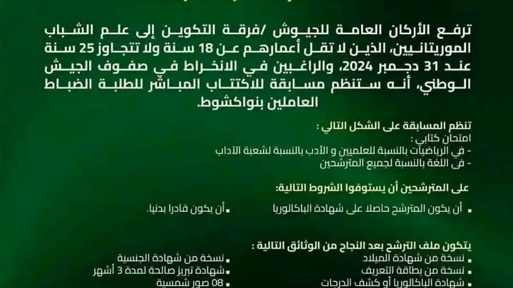 وقال الجيش في بيان، إن المسابقة مفتوحة أمام الشباب الموريتانيين الذين لا تقل أعمارهم عن 18 سنة ولا تتجاوز 25 سنة عند 21 ديسمبر 2024.