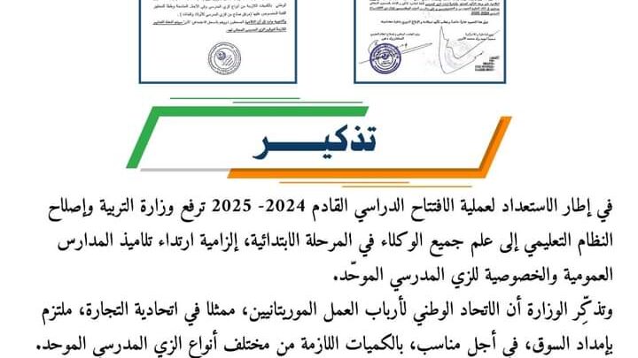 وذكَّرت الوزارة أن الاتحاد الوطني لأرباب العمل ممثلا في اتحادية التجارة مُلتزم بإمداد السوق في أجل مناسب بالكميات اللازمة من مختلف أنواع الزي المدرسي الموحد.