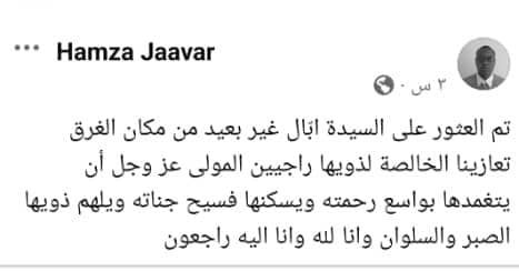 ووفق تدوينة للعمدة على فيسبوك فقد تم العثور على السيدة ابال بنت بلخير بسيف على بعد مسافة قليلة من مكان غرقها بين شلخت أهل سبرو وشلخت فاطمة.