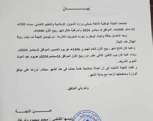 أعلنت اللجنة الوطنية لمراقبة الأهلة الخميس الموافق 05 سبتمبر 2024، فاتح شهر ربيع الأول للعام الهجري 1446 هجرية.