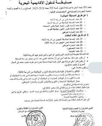 الإعلان عن مسابقة لوزارة الصيد ستجري فى الاكاديمية البحرية، وهى مفتوحة أمام الشباب الموريتانى ممن لا تقل أعمارهم عن 18عاما ولا تزيد عن 25عاما.
