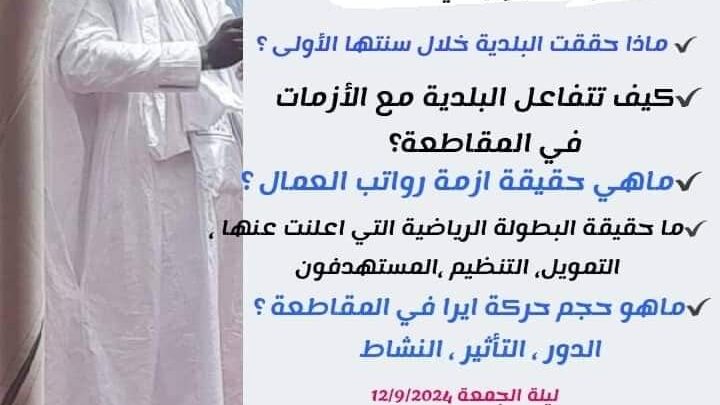 لقاء خاص هذا المساء مع العمد المساعد لبلدية تيارت و عضو مكتب إيرا في المقاطعة السيد محكد ولد صمب على تمام الساعة مساء فكونو في الموعد
