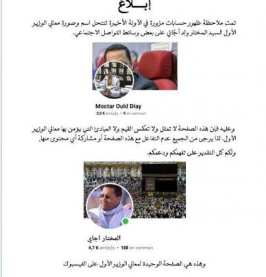 حذرت الوزارة الأولى مما اعتبرته حسابات مزيفة باسم الوزير الأول المختار ولد أجاي على الفيسبوك محذرة من التفاعل مع مثل هذه الحسابات.