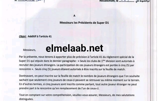 نزولا عند رغبة الهلال السوداني… قطاع المسابقات في الاتحاد الموريتاني لكرة القدم يفتح عدد المحترفين المسموح بهم في المباراة، في الدوري الممتاز، على أن لا يزيد عدد الموجود فوق أرضية الملعب 5 فقط.
