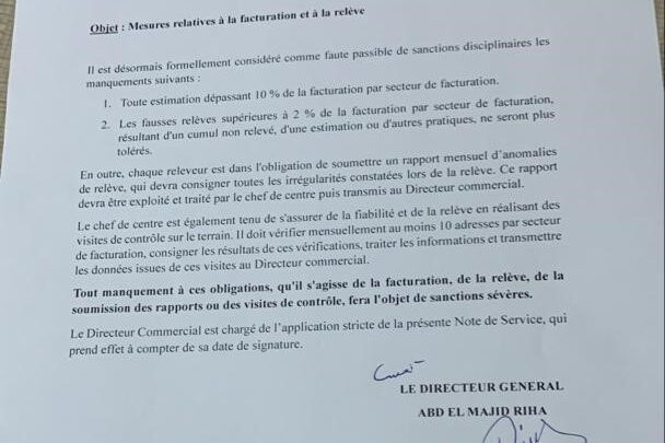 وتشمل المذكرة “التي يبدأ سريانها من تاريخ توقيعها” مطالبة “رئيس المركز بالتأكد من مدى صدقية الجرد، من خلال القيام بزيارات تفتيش ميدانية، فعليه التحقق شهريا من 10 عناوين على الأقل لدى قطاع الفوترة، وتسجيل نتائج التحقق، ومعالجة المعلومات، وإرسال المعطيات المتحصل عليها من خلال الزيارات إلى المدير التجاري”.