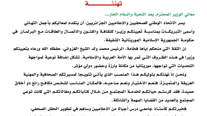 للتذكير فإن هذه التهنئة تنضاف لمجموعة من التهانئ قدمتها عدة نقابات صحفية، من أبرزها نقابة الصحفيين الموريتانيين ونقابة الصحافة المغربية، تنويها بهذا الاختيار الذي تلقفه الحقل الصحفي بارتياح تام.
