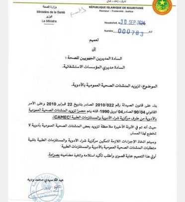 وشددت الوزارة في التعميم حصر تزويد المنشآت الصحية العمومية من طرف مركزية شراء الأدوية والمستلزمات الطبية وذلك بناءً على قانون الصيدلة رقم 2010/022 الصادر بتاريخ 22 فبراير 2010 وعلى الأمر القانوني 90/04 الصادر 04 إبريل 1990 .