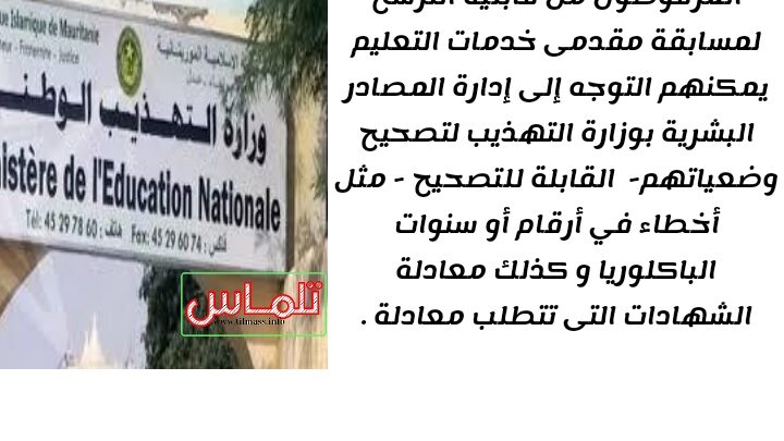 المرفوضون من قابلية الترشح لمسابقة مقدمى خدمات التعليم يمكنهم التوجه إلى إدارة المصادر البشرية بوزارة التهذيب لتصحيح وضعياتهم- القابلة للتصحيح – مثل أخطاء في أرقام أو سنوات الباكلوريا و كذلك معادلة الشهادات التى تتطلب معادلة .