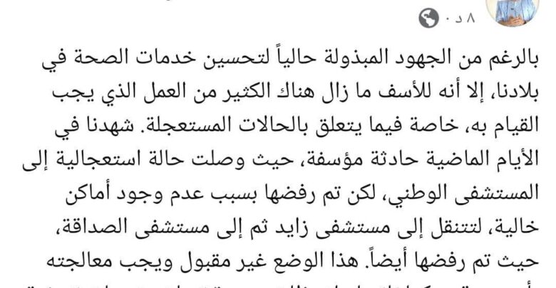 وقال ولد بوحبيني في تدوينة على حسابه في فيسبوك إن الأيام الماضية شهدت “حادثة مؤسفة، حيث وصلت حالة استعجالية إلى المستشفى الوطني، لكن تم رفضها بسبب عدم وجود أماكن خالية، لتتنقل إلى مستشفى زايد ثم إلى مستشفى الصداقة، حيث تم رفضها أيضا”.