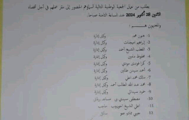 الجمعية الوطنية تنذر مجموعة من العمال و تطالبهم بالحضور إلى مقر عملهم في أجل أقصاه ؛الاثنين 28 أكتوبر 2024 عند الساعة الثامنة صباحا.