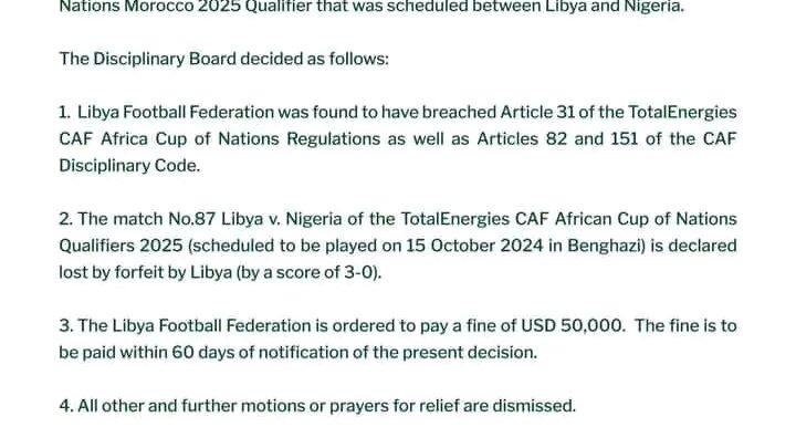 الكاف: يعلن اعتبار منتخب نيجيريا فائزاً و تغريم الاتحاد الليبي ٥٠ ألف دولار أمريكي