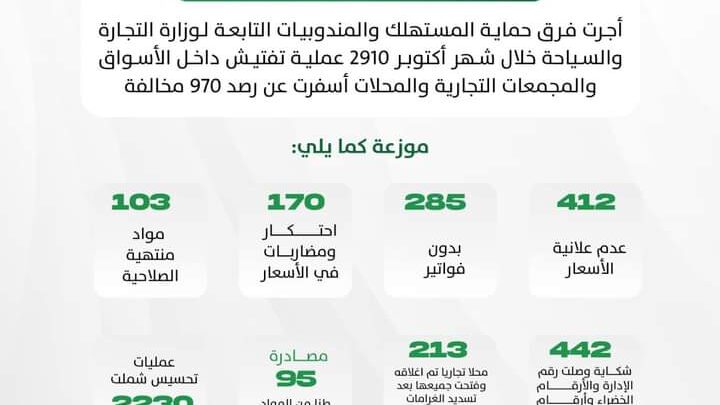 أجرت فرق حماية المستهلك والمندوبيات التابعة لوزارة التجارة والسياحة خلال شهر أكتوبر 2910 عملية تفتيش داخل الأسواق والمجمعات التجارية والمحلات أسفرت عن رصد 970 مخالفة وقد تميز شهر أكتوبر بما يلي: