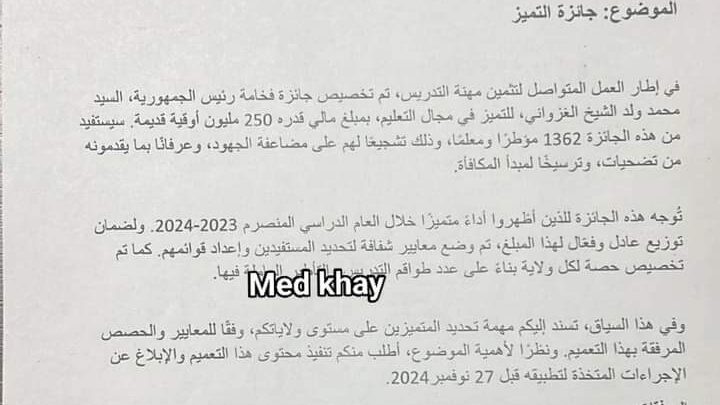 وزارة التربية تعلن اسناد جائزة التميز ل1362 مؤطرا و معلما و تترك للادارات الجهويين تحديد المعنيين وفق شبكة المعايير المرفقة