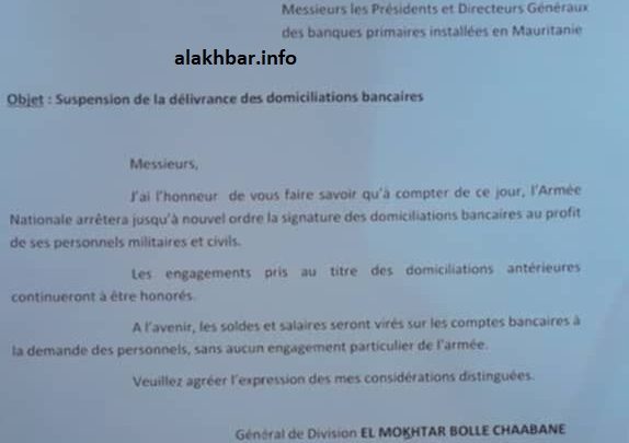 وأضاف ولد شعبان في رسالة وجهها لمديري البنوك الأولوية والمؤسسات المالية أنه ابتداء من الآن فإن الجيش لن يمنح أي إفادة لتوطين الراتب لأي من أفراده العسكريين أو المدنيين.