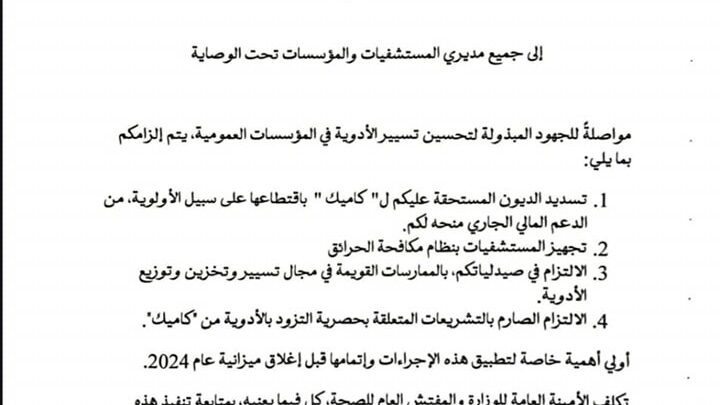 كما شدد الوزير على ضرورة الالتزام الصارم بالتشريعات المتعلقة بحصرية التزود بالأدوية من “كاميك”، ودعا مديري المستشفيات إلى الالتزام في الصيدليات بالممارسات القويمة في مجال تسيير وتخزين وتوزيع الأدوية.