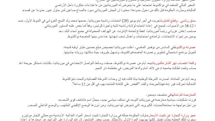 3سباق رئاسي.. وقطع للانترنتأجريت في آخر أيام يونيو (29) انتخابات رئاسية بموريتانيا، حسمها محمدولد الشيخ الغزواني في الشوط الأول، بنسبة 56،12 من الأصوات، لينجح في إعادة انتخابه لولاية رئاسية ثانية وأخيرة كرئيس، وفقاً لما ينص عليه الدستور الموريتاني. صاحب إعلان غزواني رئيساً لموريتانيا، انقطاع لخدمة الإنترنت عن الهواتف المحمولة في جميع أنحاء البلد، بعد يومين من إجراء الانتخابات، تزامنامع احتجاجات وأعمال شغب شهدتها عدة مدن بينها العاصمة نواكشوط.