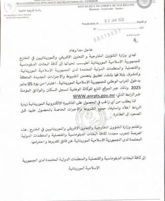 و أشعرت الوزارة في مذكرة وجهتها للبعثات الدبلوماسية و القنصلية و المنظمات الدولية العاملة بموريتانيا، بإطلاق نظام التأشيرة الإلكترونية اعتبارًا من 5 يناير 2025، حيث سيصبح إلزاميا على المسافرين الاجانب، اعتبارا من 5 يناير 2024، التقدم بطلب للحصول على تأشيرة إلكترونية و ذلك قبل صعود إلى الطائرة باتجاه موريتانيا..
