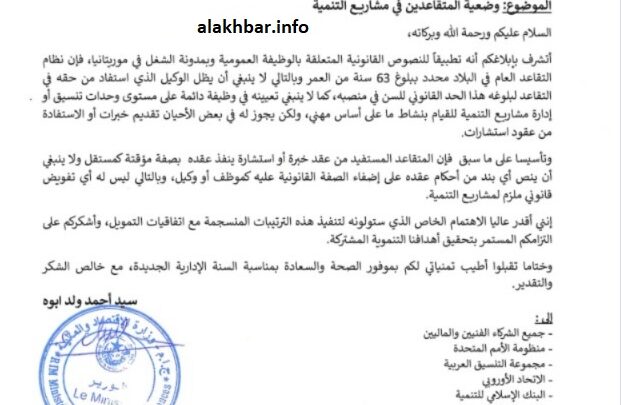 وأضاف الوزير في الرسالة التي حصلت وكالة الأخبار المستقلة على نسخة منها أنه لا ينبغي تعيين من بلغ هذه السن “في وظيفة دائمة على مستوى وحدات تنسيق أو إدارة مشاريع التنمية للقيام بنشاط ما على أساس مهني”.
