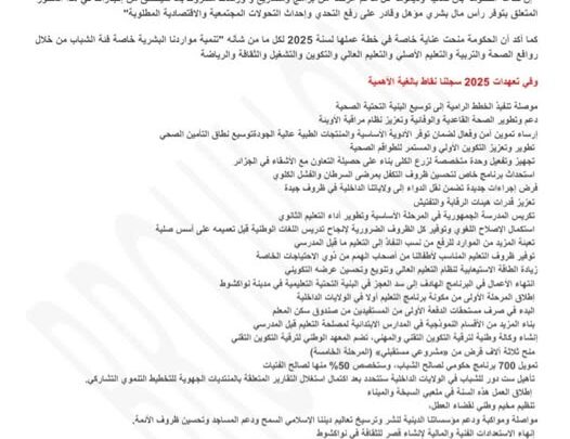 كما أكد أن الحكومة منحت عناية خاصة في خطة عملها لسنة 2025 لكل ما من شأنه “تنمية مواردنا البشرية خاصة فئة الشباب من خلال روافع الصحة والتربية والتعليم الأصلي والتعليم العالي والتكوين والتشغيل والثقافة والرياضة