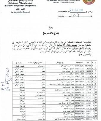 وهددت الوزارة بفصل الموظفين المعنيين بالإنذار من وظائهم، مالم يلتحقوا بعملهم خلال 72 من إذاعة البلاغ، أو يستظهروا بقوة قاهرة.
