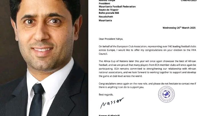 هنأ رئيس رابطة الأندية الأوروبية، عضو اللجنة التنفيذية للاتحاد الأوروبي لكرة القدم، ورئيس نادي باريس سان جرمان، ناصر الخليفي، رئيس الاتحادية الموريتانية لكرة القدم، أحمد ولد يحي، بمناسبة انتخابه عضواً في مجلس الاتحاد الدولي لكرة القدم؛ خلال أعمال الجمعية العامة الاستثنائية للاتحاد الأفريقي لكرة القدم، في دورتها الرابعة عشرة، التي عُقدت مؤخراً في القاهرة.