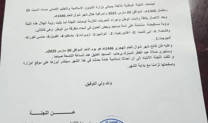 موريتانيا تُعلن غدا الأحد عيد الفطر المبارك