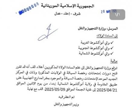 أعلنت وزارة التجهيز والنقل ،فتح دورات امتحانات رخصة السياقة في ولايات نواكشوط 3.
