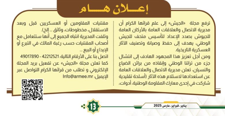 ولفتت المجلة إلى استعداد مديرية الاتصال بالأركان، لاستلام الآثار من الأسلحة التقليدية التي شاركت في إحدى معارك المقاومة الوطنية، وأدوات المقاومين والعسكريين ومقتنياتهم، قبل الاستقلال وبعده، إضافة للمخطوطات والوثائق.