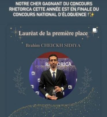 فاز الطالب إبراهيم ولد الشيخ سيديا بالمركز الثاني في المسابقة الوطنية للخطابة باللغة الفرنسية، التي تُنظم سنويا بمشاركة طلاب من جميع المراحل من مختلف مؤسسات التعليم في البلاد.