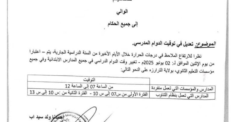 و كان والى اترارزه قد أصدر تعميما يوم 11 ابريل الماضى بتقليص أوقات الدوام إلى الواحدة زوالا ، لكن الارتفاع المتلاحق لدرجات الحرارة جعل السلطات الإدارية تقلص أوقات الدوام من جديد .