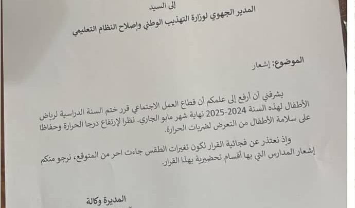 قطاع الشؤون الشؤون الاجتماعية يقرر اختتام العام الدراسي نهاية مايو الجاري و يأسف لعدم التنسيق مع وزارة التربية بسبب موجة الحر المفاجئة.